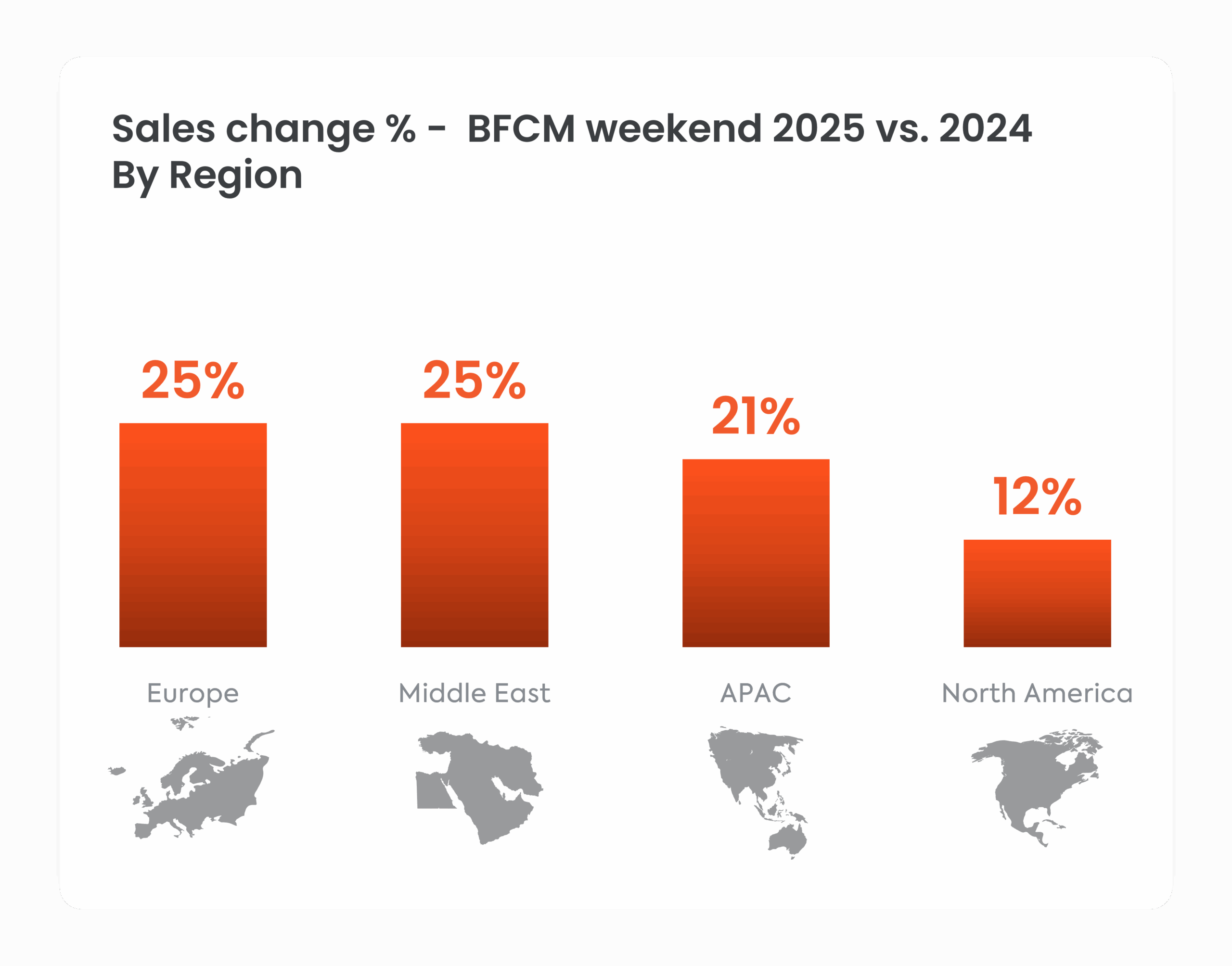 YoY sales growth over the 2025 BFCM weekend was seen across all regions. APAC rebounded after a slower BFCM last year, recording a notable 21% YoY uplift in weekend sales. Europe delivered strong performance with a 25% YoY increase, supported by an impressive spike in sales seen across many markets in the region. The Middle East, showing a similar growth rate, continued the positive momentum observed in this region throughout the year. North America saw a 12% YoY uplift, maintaining the rate recorded during the 2024 BFCM weekend, with growth this year led by the strong positive trend seen in Canada.