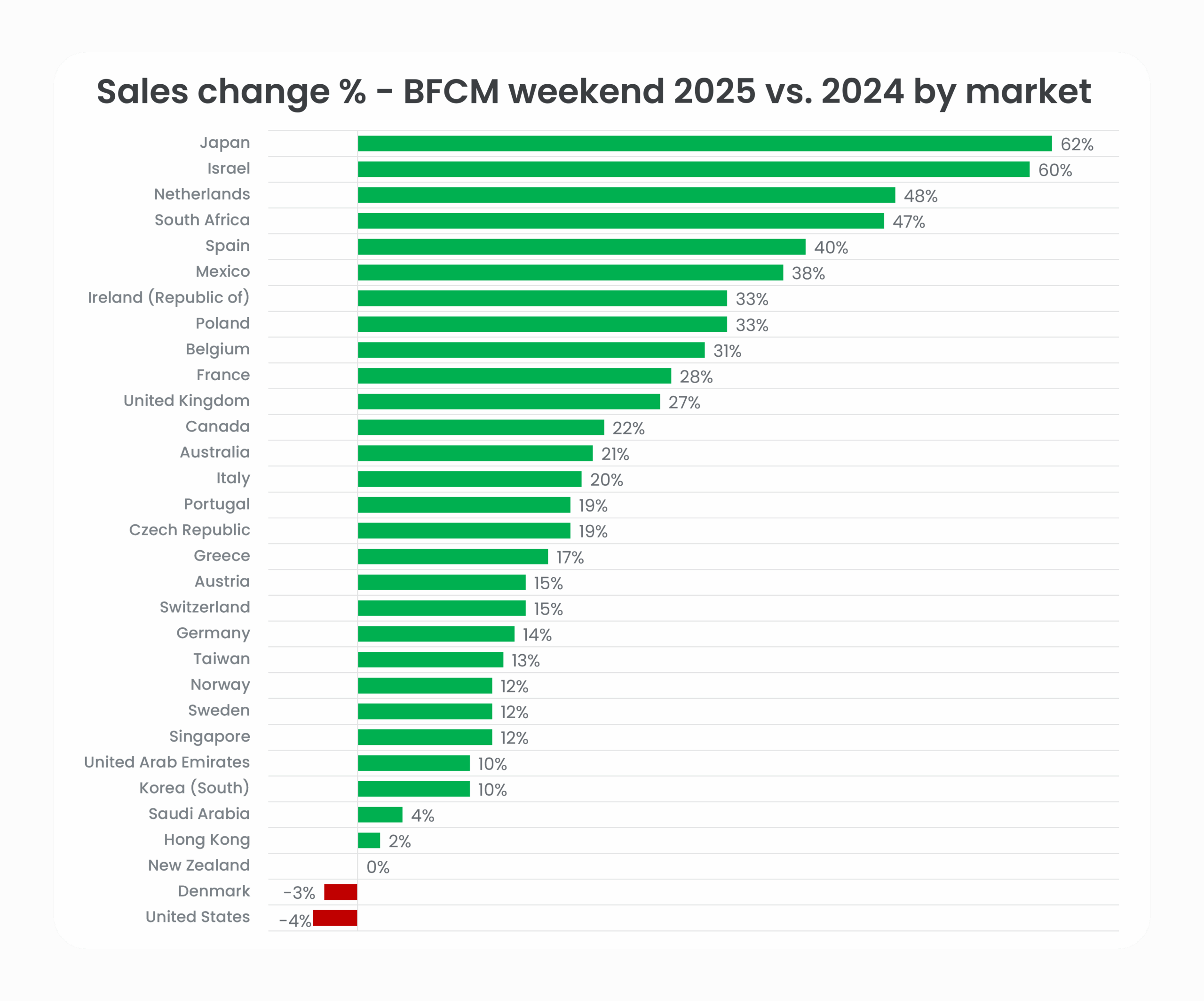 YoY sales growth over the 2025 BFCM weekend was seen across many markets worldwide, underscoring BFCM’s global prominence as a key e-commerce peak. The top-performing markets – Japan, Israel, the Netherlands, South Africa, Spain, and Mexico – demonstrate the popularity of this shopping event across shoppers and markets worldwide.